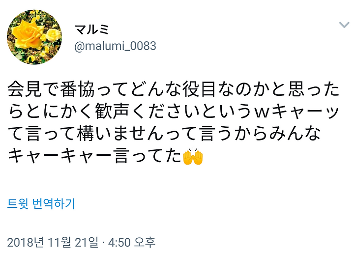 회견에서 방송협력은 어떤 역할이냐고 했더니 어쨌든 함성해주세요. 꺄악! 하고 말하셔도 상관없습니다. 라고 해서 꺄꺄 했다