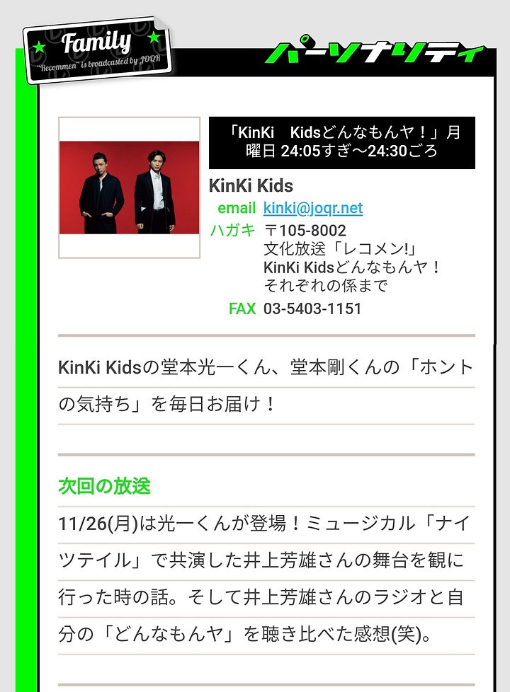 11/26(月)は光一くんが登場!ミュージカル「ナイツテイル」で共演した井上芳雄さんの舞台を観に行った時の話。そして井上芳雄さんのラジオと自分の「どんなもんヤ」を聴き比べた感想(笑)。
