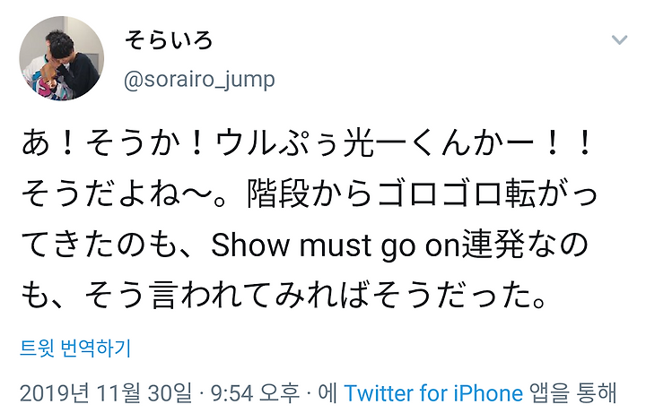 아 그렇구나! 울푸 코이치군인건가~ 그렇네~ 계단에서 데굴데굴 굴러온 것도, Show must go on 연발인 것도, 그렇게 듣고 보니 그랬다.