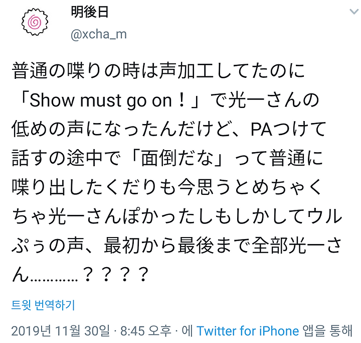 평범히 말 할 때는 목소리 가공했었으면서 "Show must go on!"에서 코이치씨의 낮은 목소리가 되었는데, "PA"붙이면서 말하는 도중에 "귀찮네" 라고 평범하게 말 꺼낸 부분도 지금 생각하니 엄청 코이치상같았고 혹시 울푸 소리, 처음부터 끝까지 다 코이치상....??
