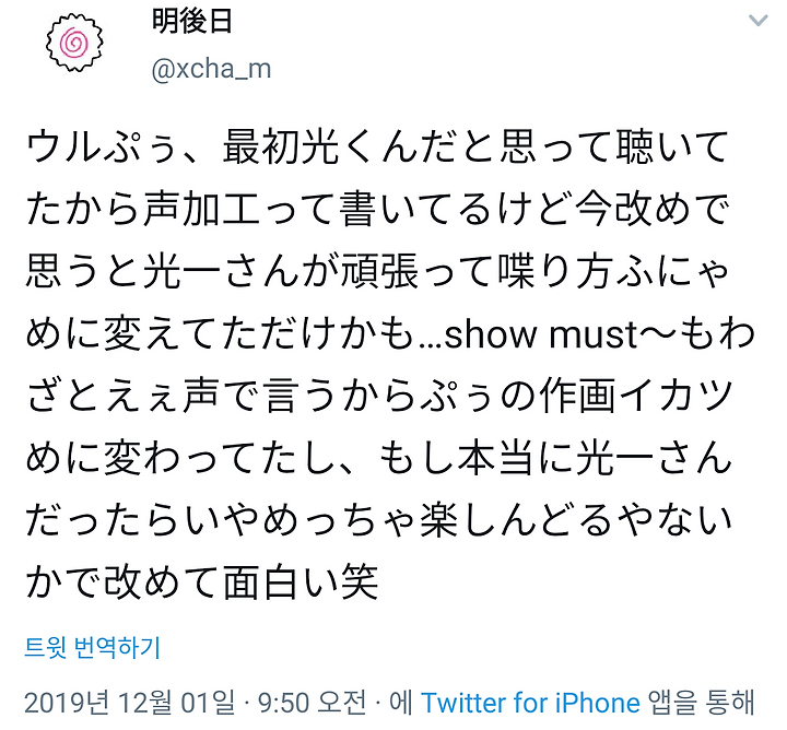 울푸, 처음에 코이치군이라고 생각하고 들었기 때문에 목소리 가공이라고 썼는데 지금 다시 생각하면 코이치씨가 열심히 말투 흐믈하게 바꿨을 뿐인지도... show must~도 일부러 좋은 목소리로 말하니까 푸의 작화도 화난 것 처럼 바뀌었고, 혹시 정말 코이치씨였으면 이야 엄청 즐기고 있잖아 싶어서 다시 재미있는 웃음.