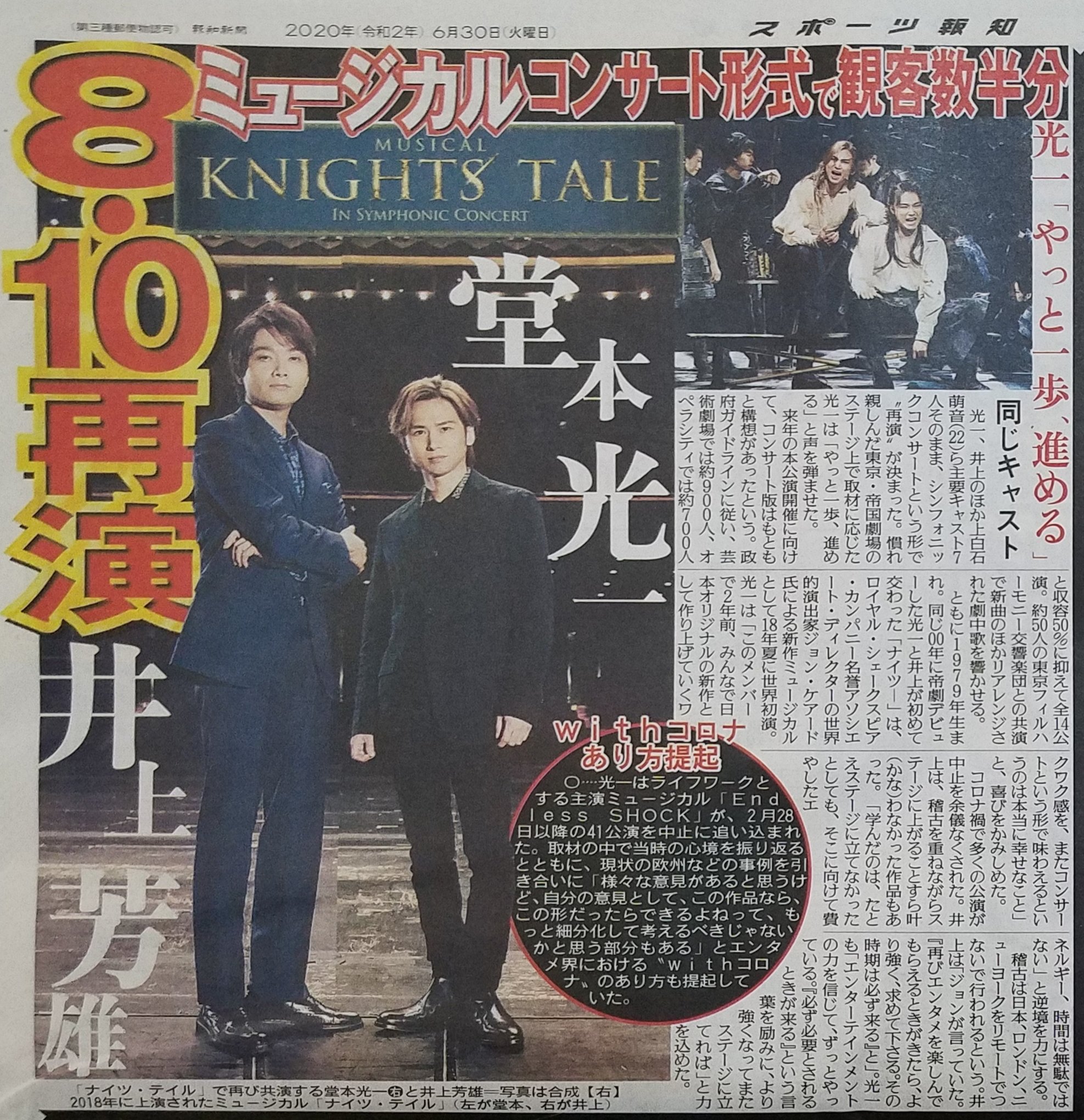 堂本光一さん、井上芳雄さんら主要キャスト7人そのまま、シンフォニックコンサートという形で「ナイツ・テイル-騎士物語」の再演が決まった(8月10日~22日)。政府ガイドラインに従い、芸術劇場では約900人、オペラシティでは約700人と収容50%に抑えて全14公演。《6月30日 スポーツ報知》